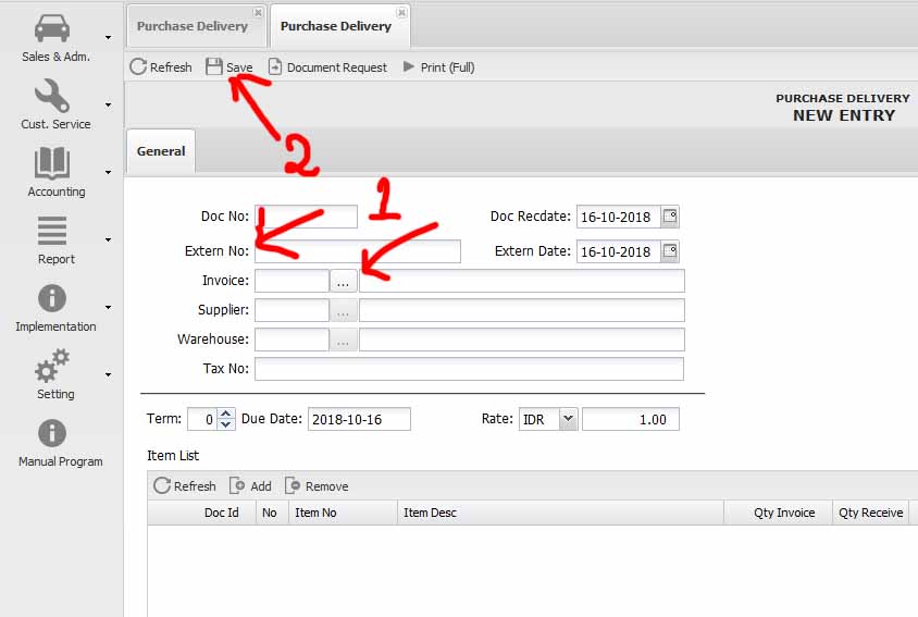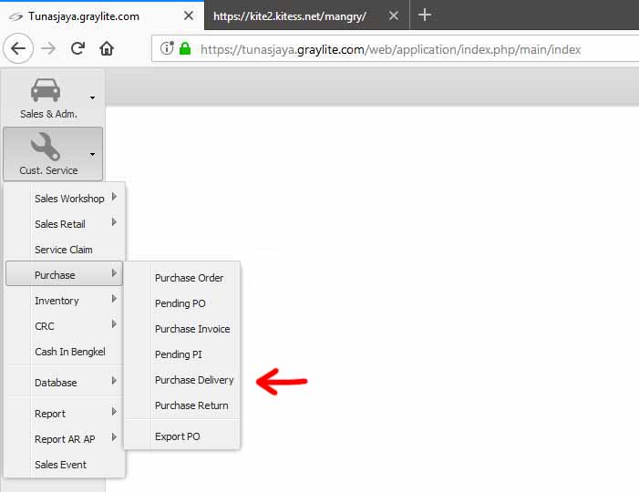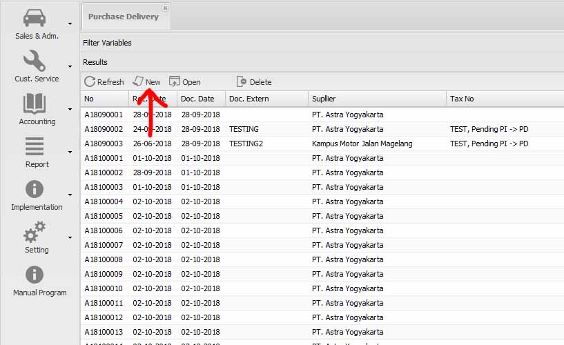 Modul Purchase Order dapat di buka dari menu Cust. Service > Purchase > Purchase Delivery