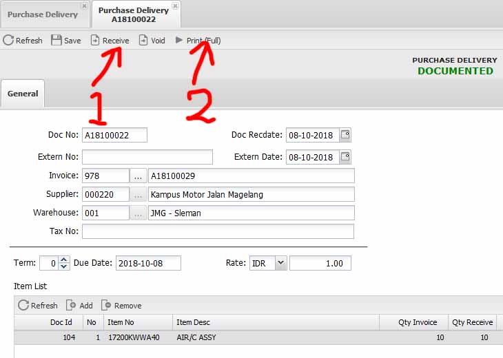 Lanjutkan proses dengan input item yang diterima di tabel "Item List"