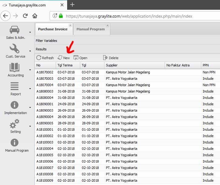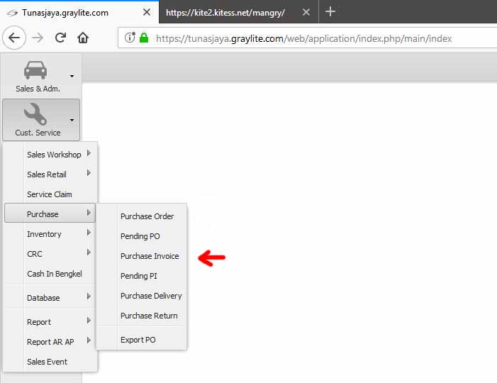 Modul Purchase Invoice dapat di buka dari menu Cust. Service > Purchase > Purchase Invoice