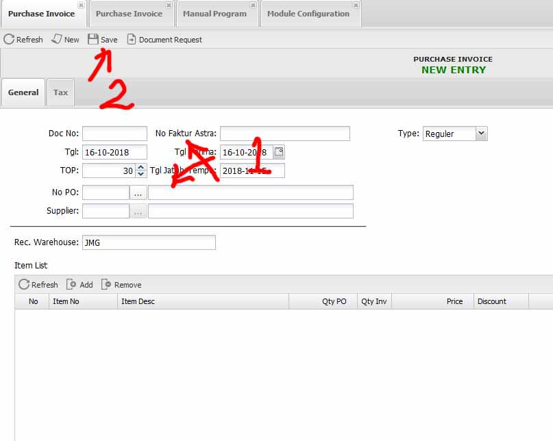 Lanjutkan proses dengan input item yang ada di Purchase Order di tabel "Item List"