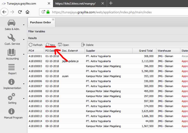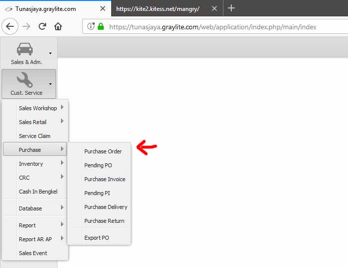 Modul Purchase Order dapat di buka dari menu Cust. Service > Purchase > Purchase Order