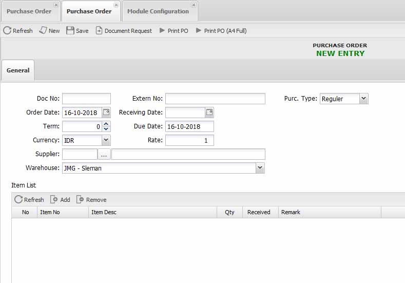 Berikut adalah tampilan dari modul Purchase Order