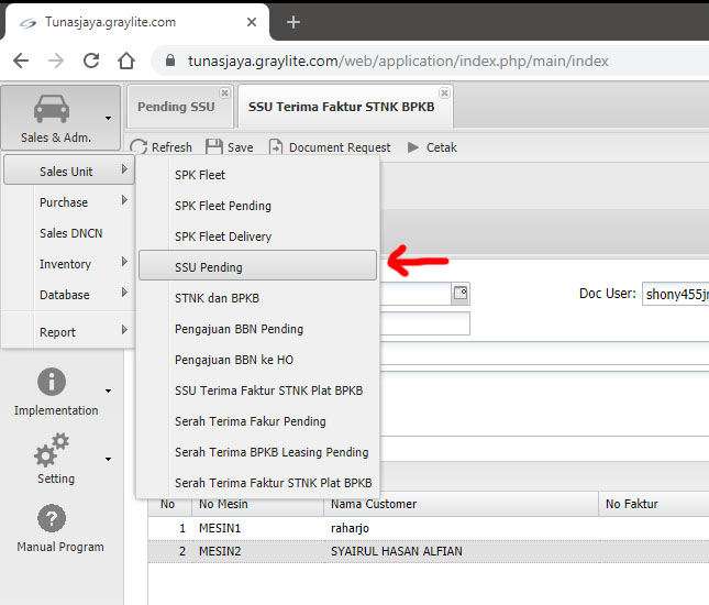 Modul Pengajuan Faktur (SSU) dapat di buka dari menu Sales & Adm > Sales Unit > SSU Pending