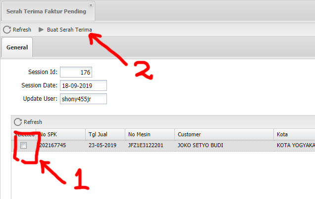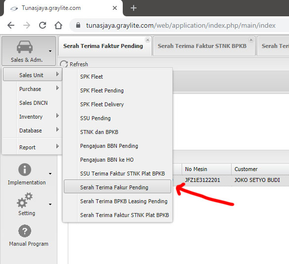 Modul ini dapat di buka dari menu Sales & Adm > Sales Unit > Serah terima faktur Pending