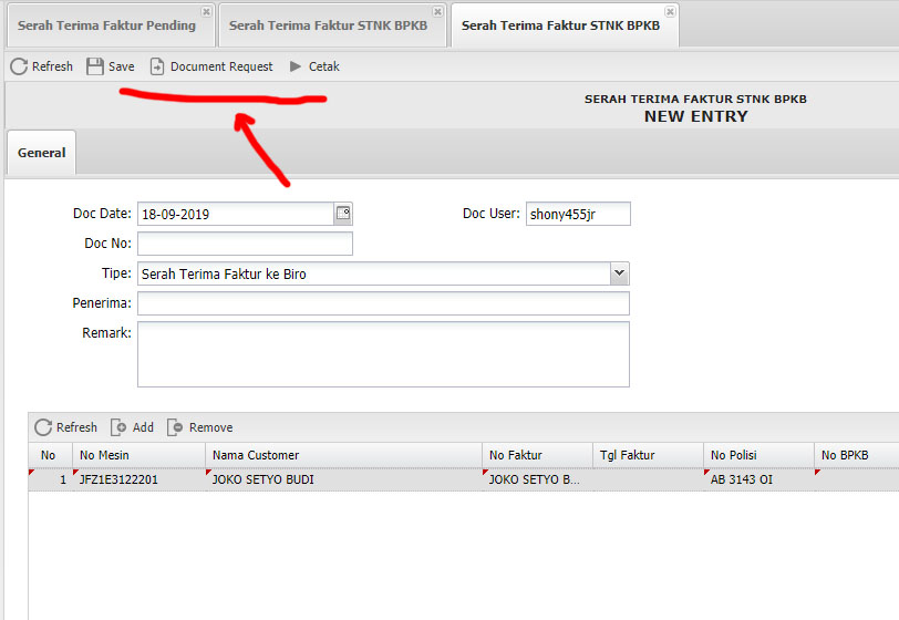 Lanjutkan tekan tombol "Save" untuk menyinpan transaksi, kemudian "document request" dan "posting"