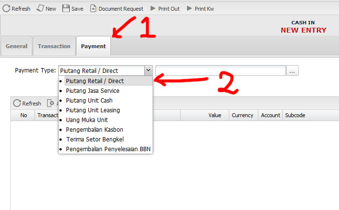 - Pada tab Payment (1) pilih Piutang Retail / Direct pada Payment Type (2)
