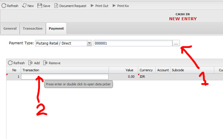 - masuk ke menu "Cash In" tekan "New" untuk membuat transaksi baru