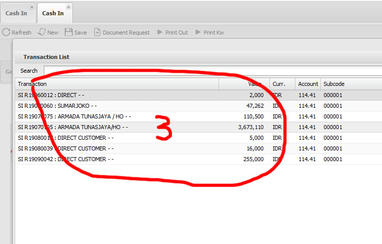 - masuk ke menu "Cash In" melalui urutan menu Cust. Accounting > Finance Opertion > Cash in