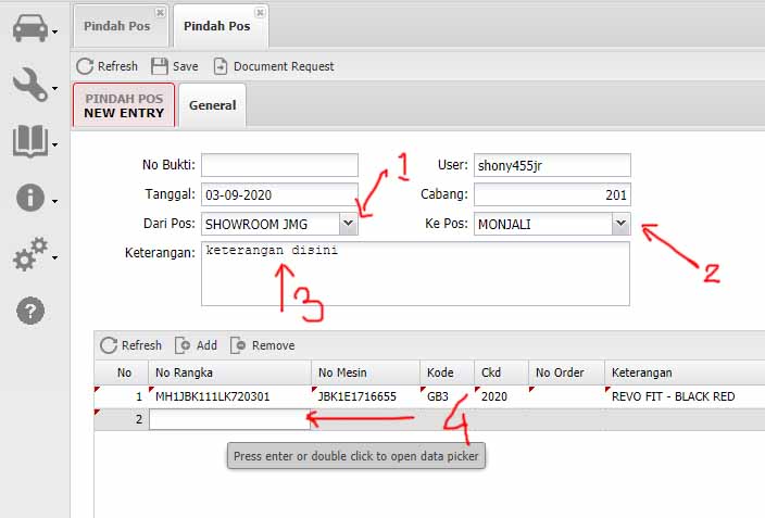 Modul ini dipakai untuk mencatat transaksi pindah unit antar pos / outlet. Jika ada pembelian dari astra maka akan dimasukkan ke pos SHOWROOM. Penjualan dapat diambil dari pos manapun ternasuk SHOWROOM. Posisi stok per showroom dapat dilihat di laporan stok unit.