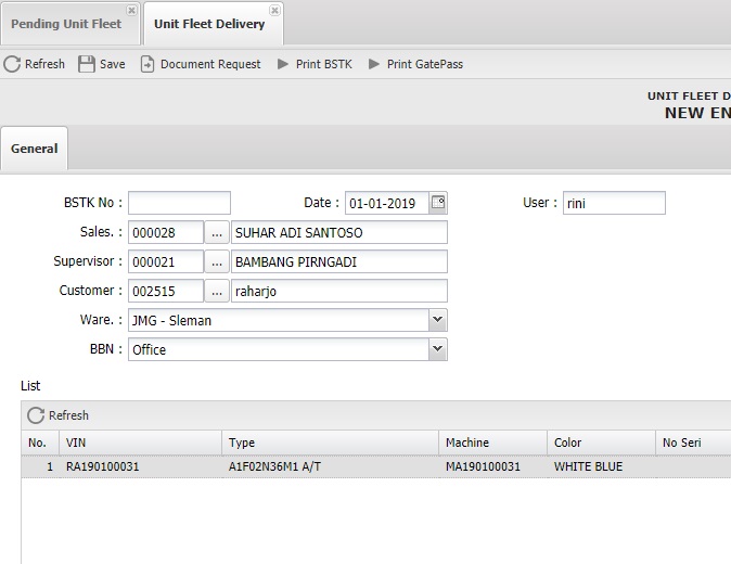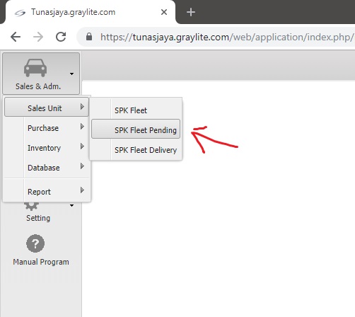 Mulai buka menu Sales & Adm. > Sales Unit > SPK Fleet Pending