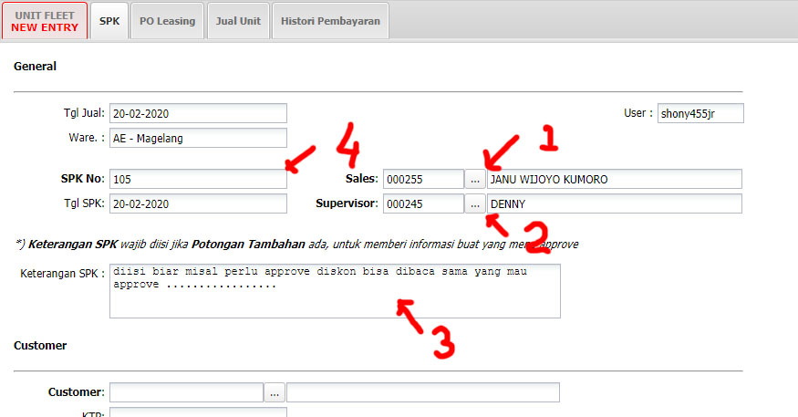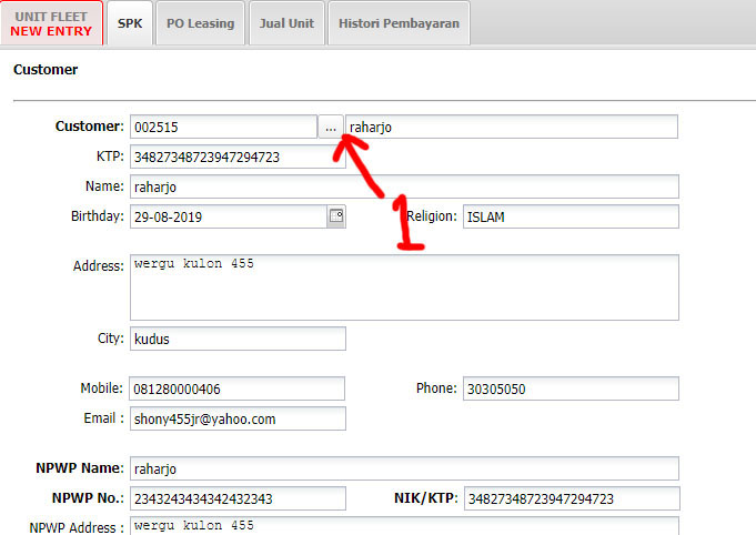- Isi Customer (1). Pastikan semua data sudah diinput di master customer dengan benar, termasuk no HP dan juga no KTP.
