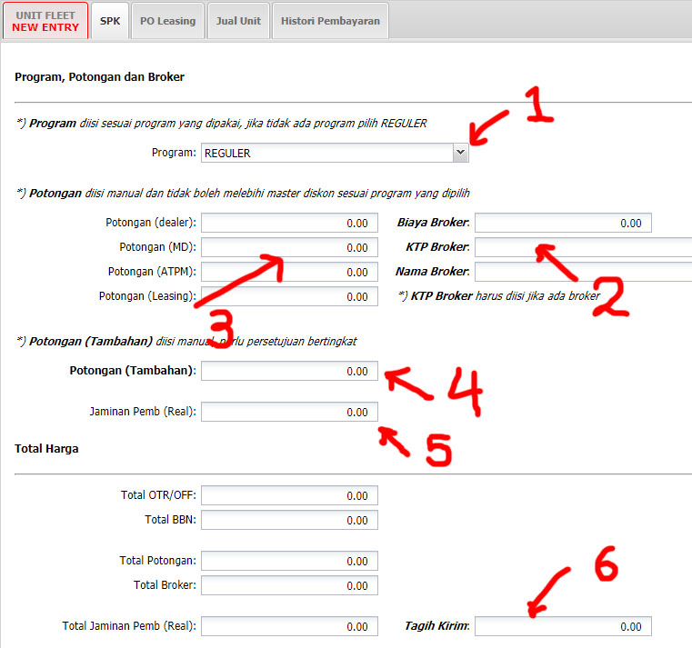 - Terdapat Master Program (Misal: ROTI, REGULER dll). Diskon yang tidak sesuai dengan program dan tipe motor dan leasing dan DP dan tenor akan ditolak oleh program. (Terdapat master program per wilayah yang dimasukkan dari HO). Pengisian DP gross dan tenor harus sesuai dengan PO agar program tidak salah tolak.